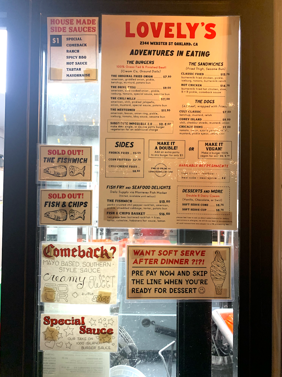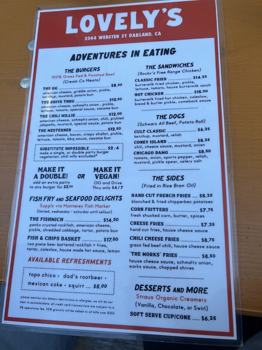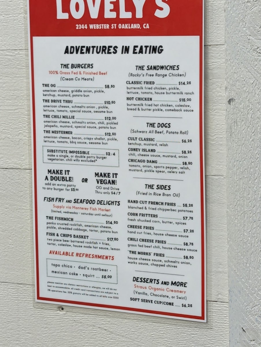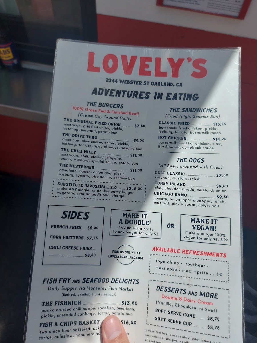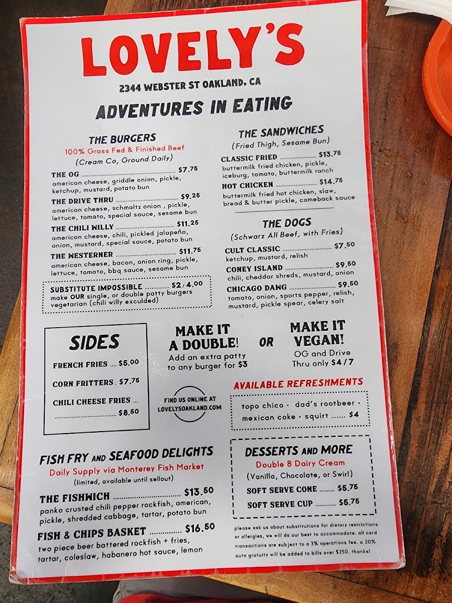 Welcome to Lovely's, a hidden gem nestled at 2344 Webster St, Oakland, CA. This local eatery masterfully combines a casual dining experience with bold, satisfying flavors that will keep you coming back for more. Known for its delicious burgers, sandwiches, and sides, Lovely's offers a culinary journey that caters to both meat lovers and vegetarians alike.